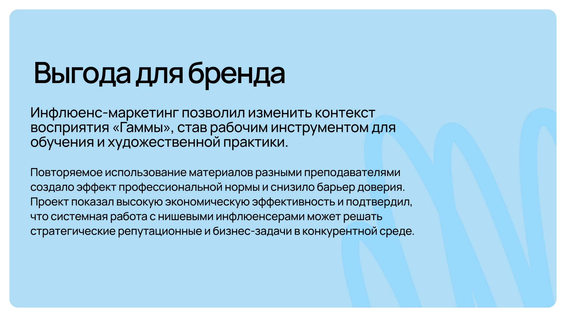Отсюда стратегия: не усиливать рекламное присутствие, а встроить «Гамму» в образовательный контекст.